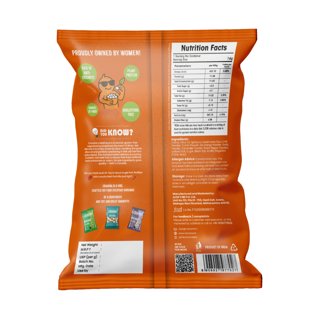 Elevate your snacking experience with Cravana Peri-Peri Makhana, the perfect blend of fiery spice and crunchy goodness. Responsibly sourced and Roasted in Olive Oil, these popped water lily seeds (Foxnuts) are tossed in our signature Hot and Spicy seasoning to satisfy your cravings without the guilt.